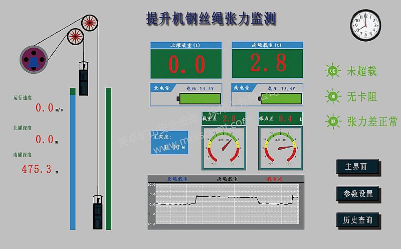 礦用提升容器承載(張力)監測裝置實現提升機鋼絲繩終端載荷實現實時在線顯示,其精度誤差小于±100Kg。設定超載噸位數值及智能判斷,通過PLC控制系統與提升機電控系統實現超載閉鎖功能。容器正常運行后,通過行程定位、數據采集、智能判斷,可及時準確判斷容器在井筒中任何位置狀況(包括容器位置、井筒卡阻、防墜器誤動作、松繩等問題)。